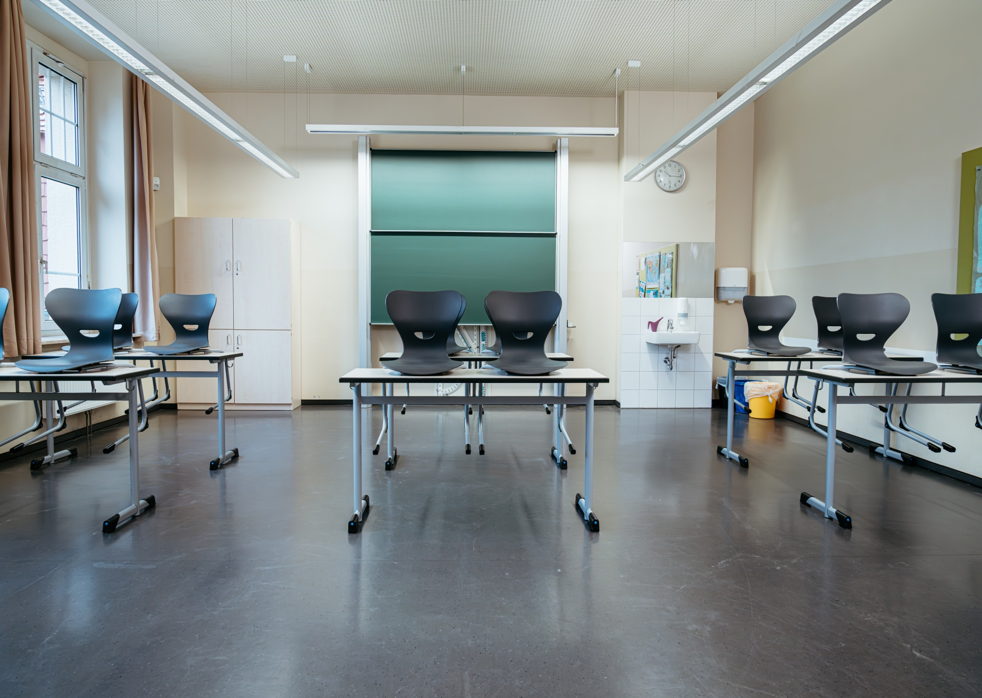 Das Bild zeigt ein gepflegtes Klassenzimmer mit aufgestellten Stühlen, modernen Möbeln und einer großen grünen Schultafel. Ein sauberes und ordentliches Lernumfeld ist entscheidend, damit Schüler konzentriert arbeiten und Lehrkräfte optimal unterrichten können.