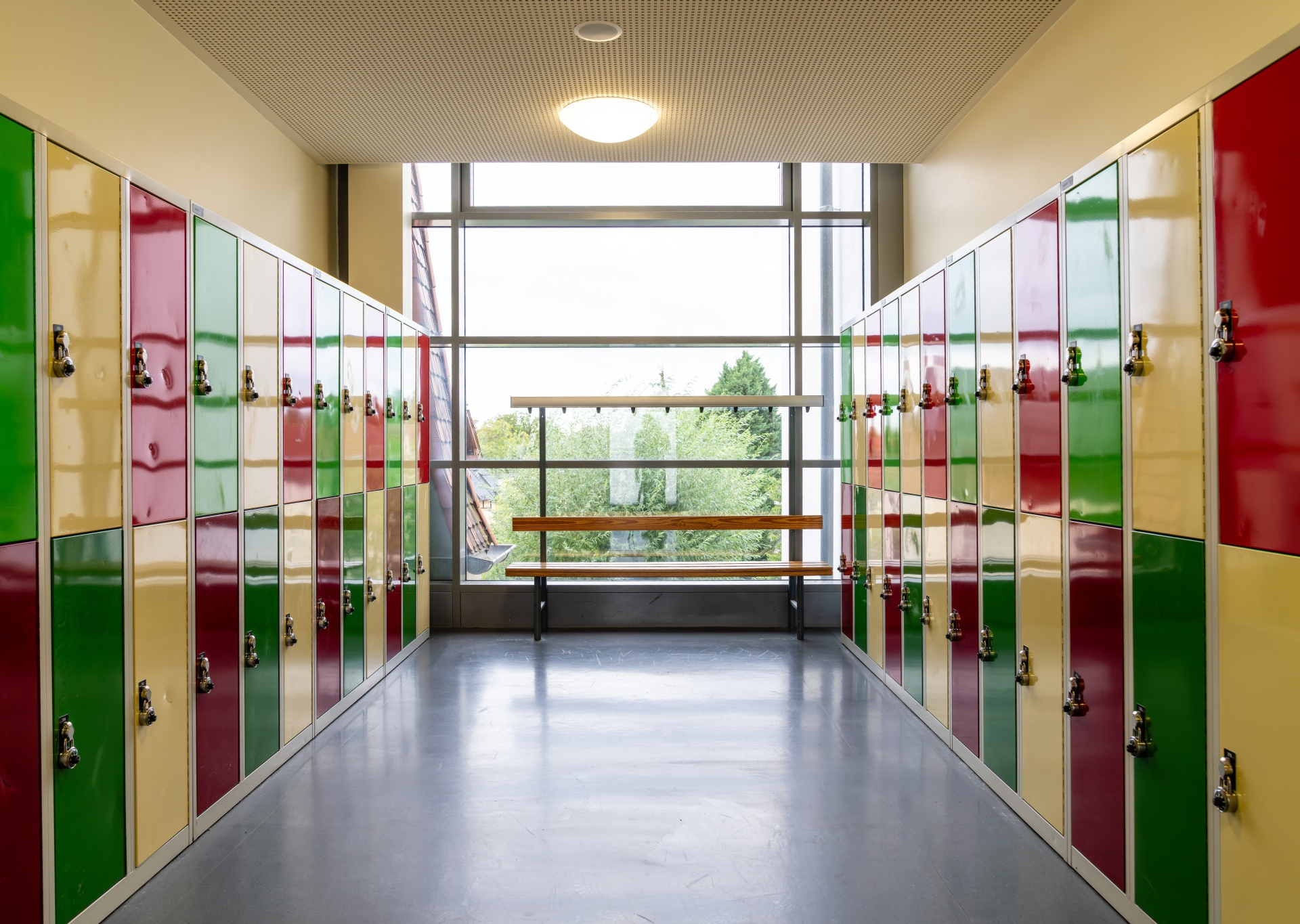 Das Bild zeigt bunte Schülerspinde in einem hellen, gepflegten Schulflur. Die glänzenden Oberflächen und der saubere Boden spiegeln eine hygienische und sichere Lernumgebung wider. Gerade in stark frequentierten Bereichen wie Fluren, Umkleiden oder Spintreihen ist eine regelmäßige Reinigung entscheidend, um Ordnung, Hygiene und ein positives Lernumfeld zu schaffen.