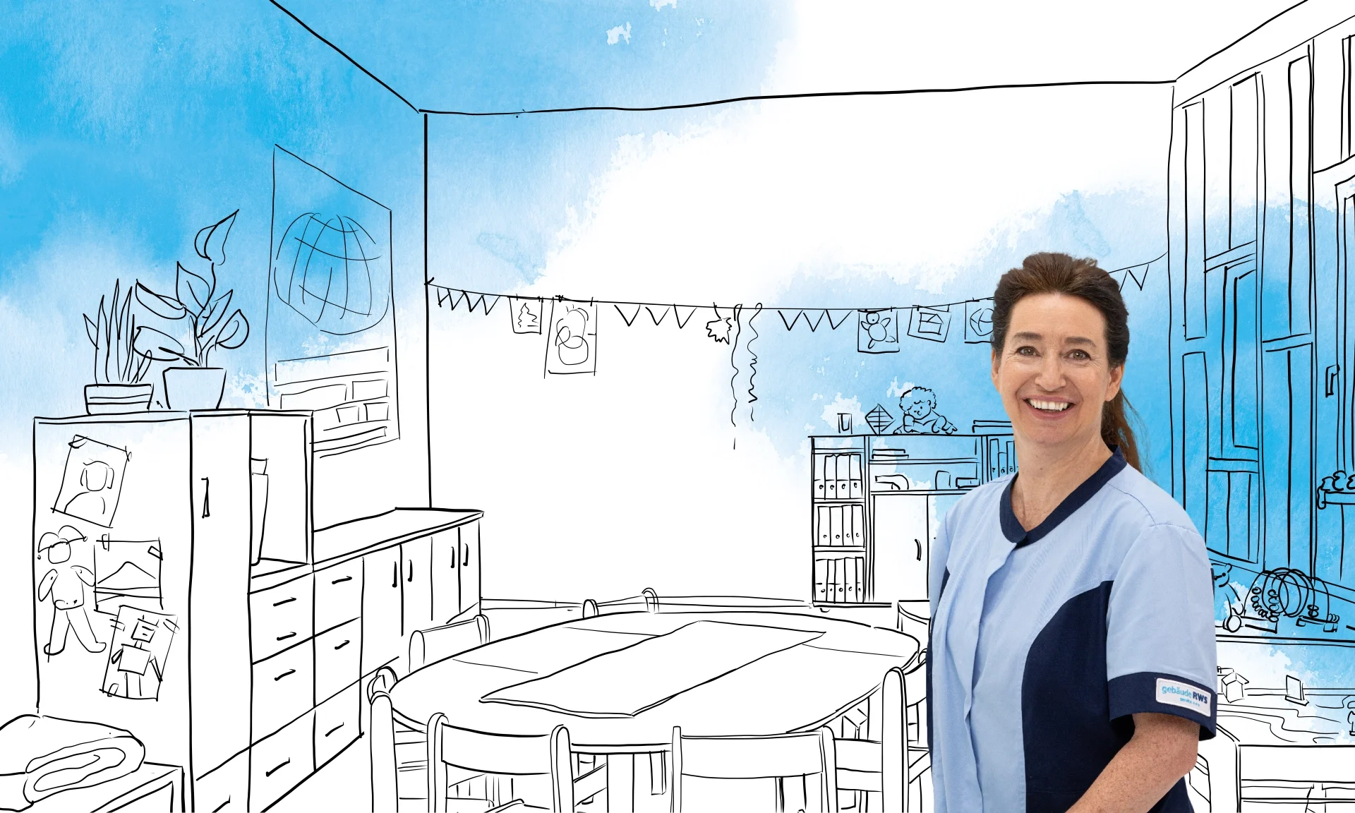 Das Bild zeigt eine Mitarbeiterin der RWS Gebäudeservice in Arbeitskleidung in einer Kindertagesstätte. RWS sorgt für Sauberkeit und Hygiene in Einrichtungen wie Kitas und Schulen, damit Kinder in einer sicheren und gepflegten Umgebung lernen und spielen können.