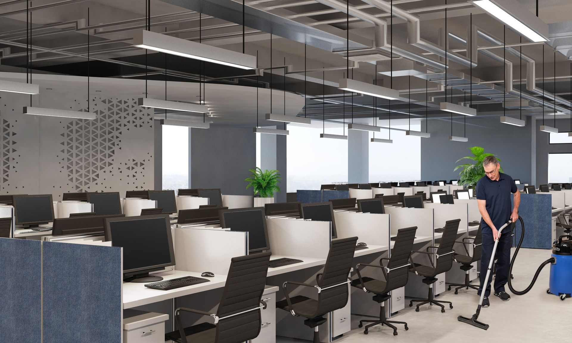 Das Bild zeigt ein modernes Großraumbüro mit mehreren Reihen an Schreibtischen und Monitoren. Ein Mitarbeiter führt die Bodenreinigung mit einem Staubsauger durch, um für Sauberkeit und Hygiene am Arbeitsplatz zu sorgen. Gepflegte Büroräume schaffen eine angenehme Atmosphäre für Mitarbeitende und tragen zur Effizienz im Arbeitsalltag bei.