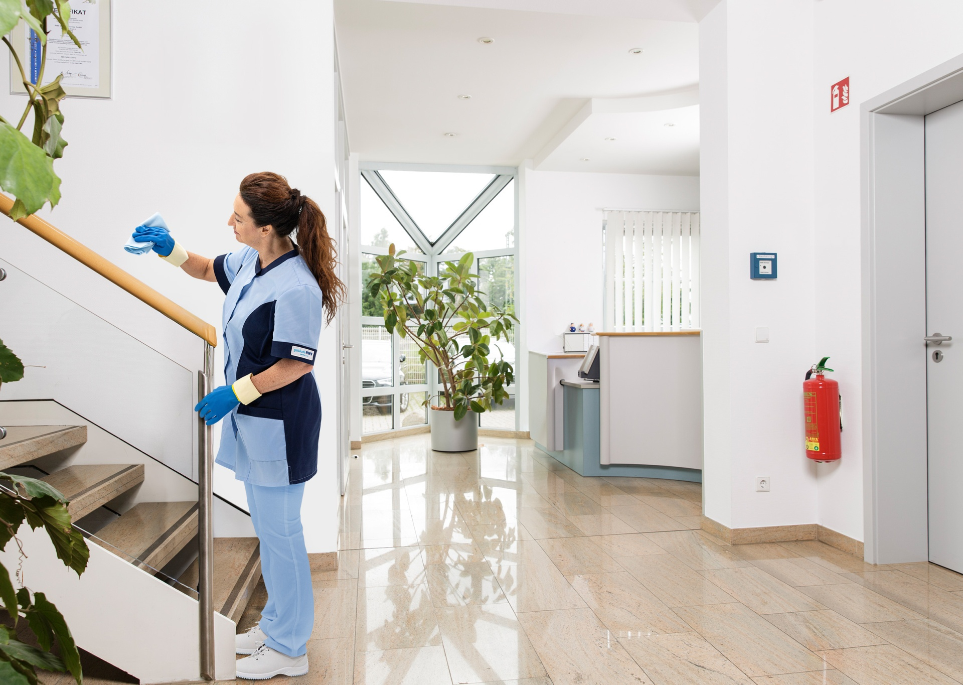 Das Bild zeigt eine Mitarbeiterin von RWS Gebäudeservice bei der Reinigung eines Treppengeländers im hellen Eingangsbereich eines modernen Bürogebäudes. Mit professioneller Sorgfalt sorgt sie für Sauberkeit und ein gepflegtes Erscheinungsbild. So trägt RWS Gebäudeservice zu einer hygienischen und einladenden Atmosphäre für Mitarbeiter und Besucher bei.