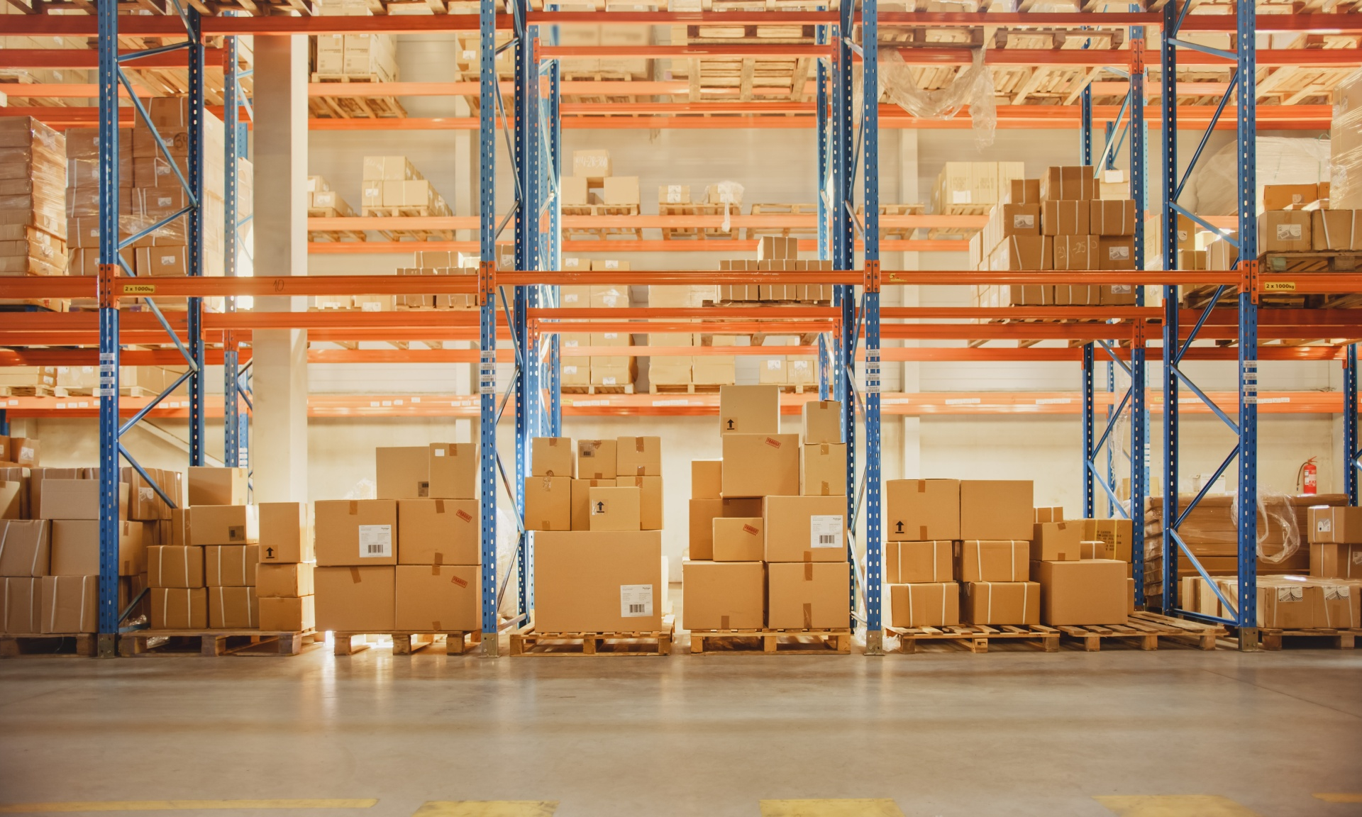Das Bild zeigt eine Lagerhalle mit hohen Regalen, in denen zahlreiche Kartons und Waren auf Paletten gestapelt sind. Eine klare Struktur und saubere Flächen sind entscheidend für reibungslose Abläufe in der Logistik und Lagerwirtschaft. Mit professioneller Unterhaltsreinigung, Grundreinigung, Hallen- und Regalreinigung sorgt RWS dafür, dass Lagerhallen nicht nur hygienisch und sicher, sondern auch effizient nutzbar bleiben – ein Plus für Unternehmen im Industrie- und Handelssektor.