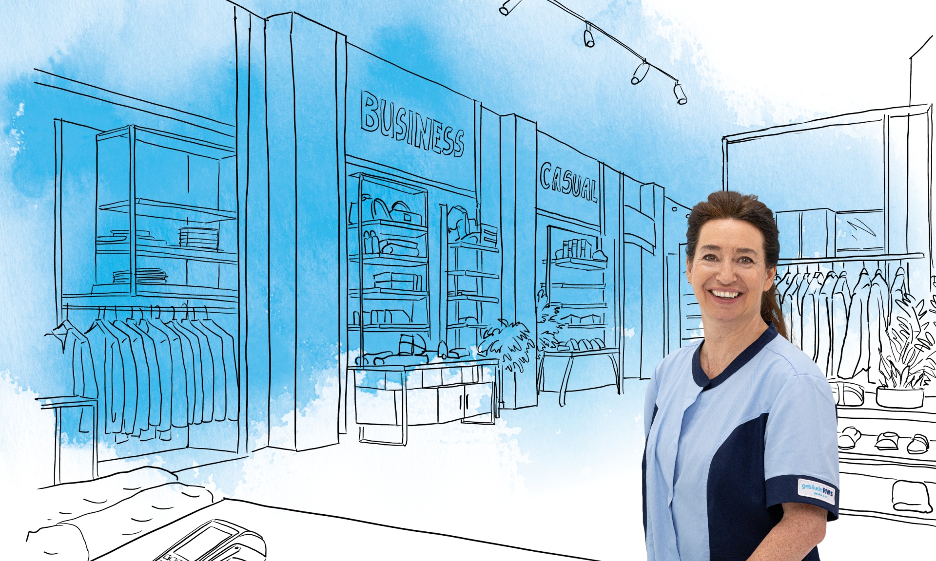 Eine Mitarbeiterin des RWS Gebäudeservice steht vor der Illustration eines Bekleidungsgeschäfts mit Verkaufsregalen und Kleiderstangen.