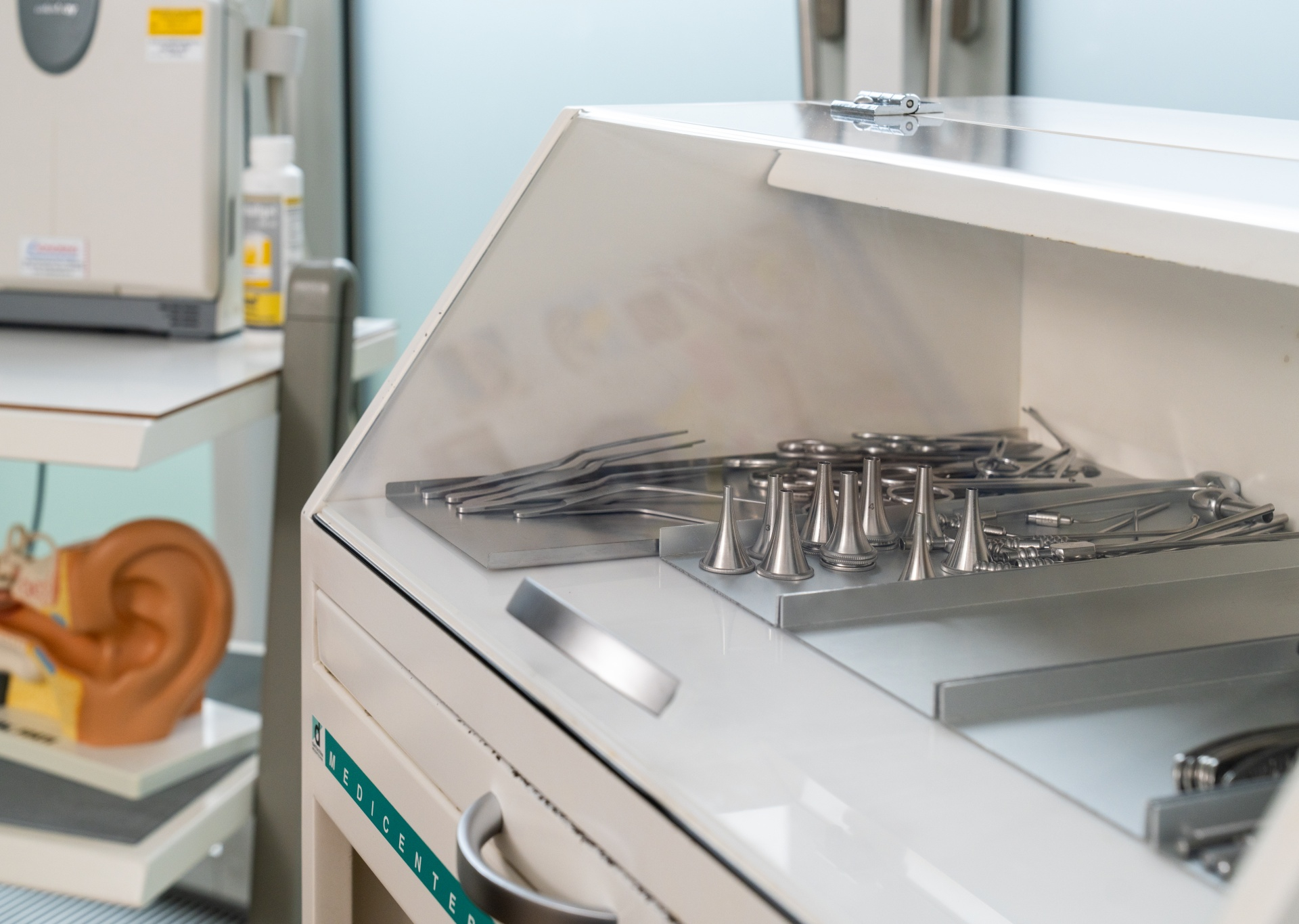 Steril aufbewahrte medizinische Instrumente in einer HNO-Praxis