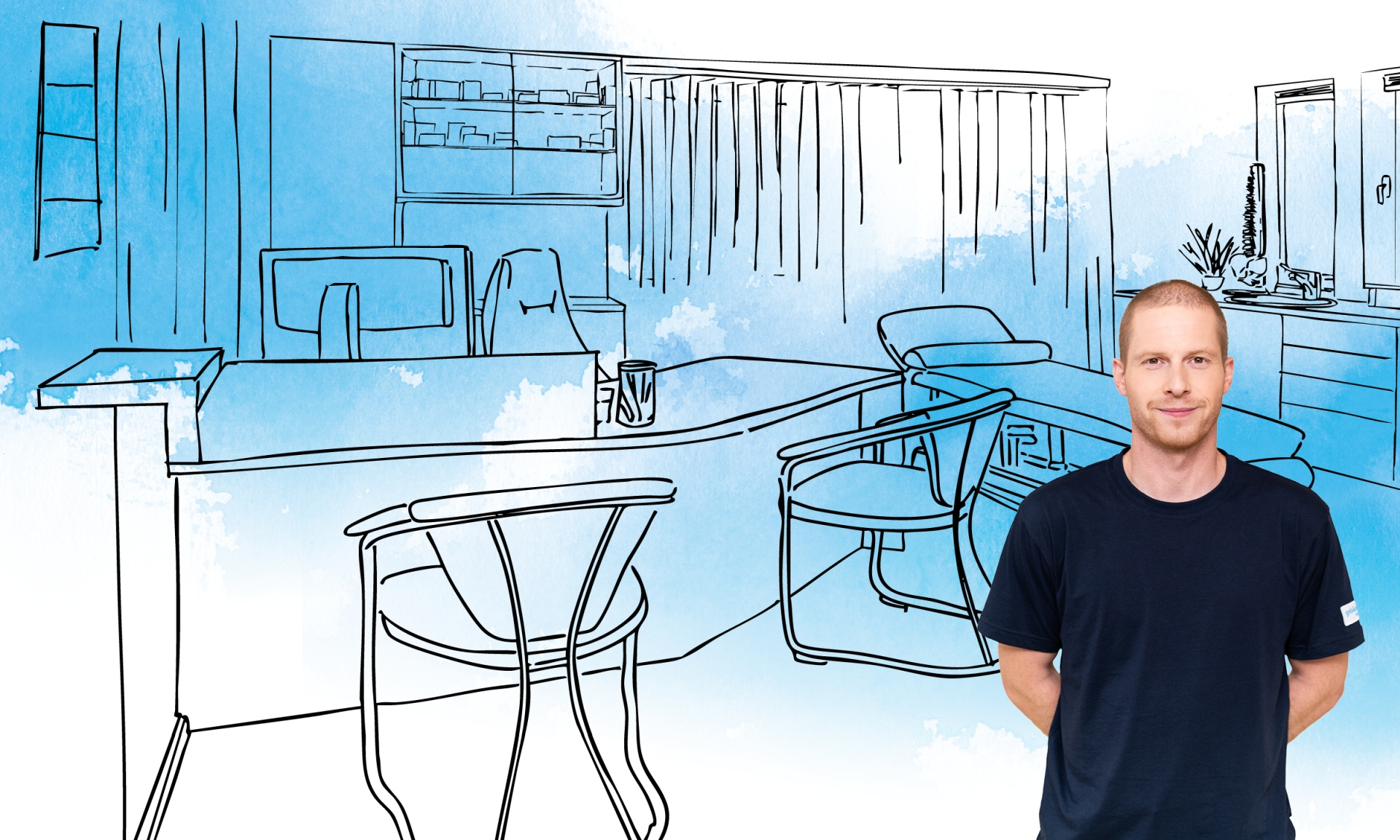 Das Bild zeigt einen Mitarbeiter der RWS Gebäudeservice GmbH vor einer illustrativen Darstellung eines Behandlungszimmers in einer Arztpraxis.