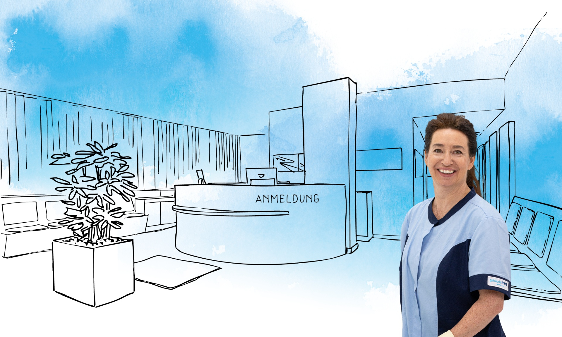Das Bild zeigt eine Mitarbeiterin der RWS Gebäudeservice GmbH in Arbeitskleidung, die vor einem illustrativ gestalteten Empfangsbereich mit der Aufschrift „Anmeldung“ steht.