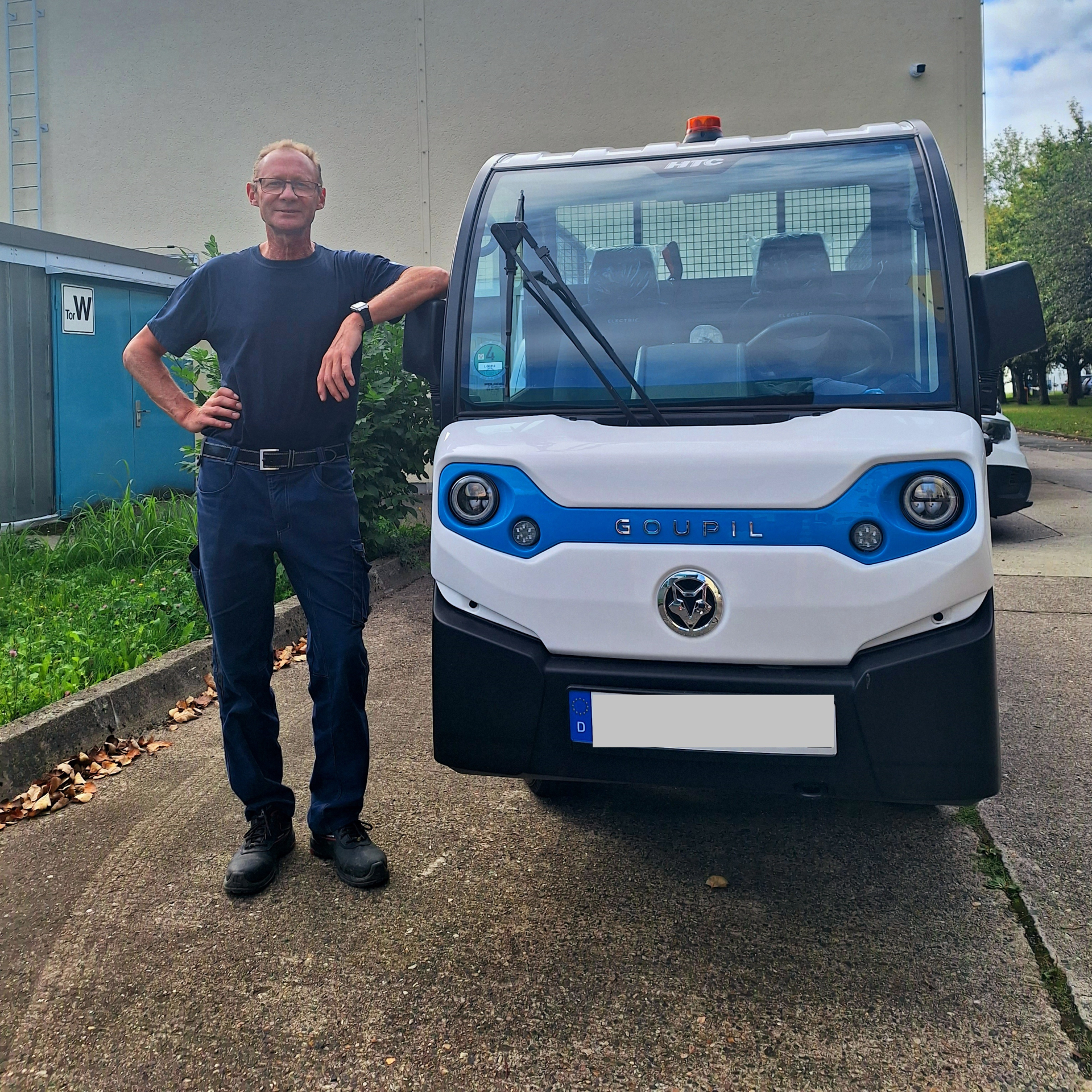 Mitarbeiter der RWS Niederlassung Chemnitz steht stolz neben seinem neuen Elektrofahrzeug